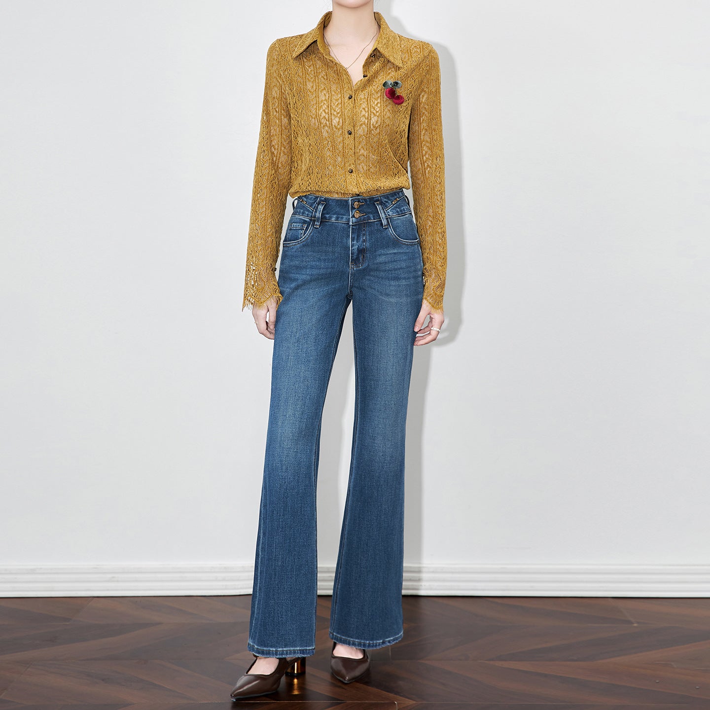 High Waist Bell Bottom Jeans Women's Elastic Slimming Casual Fish Tail Pants Vintage Style Long Polyester Fiber Commute Style