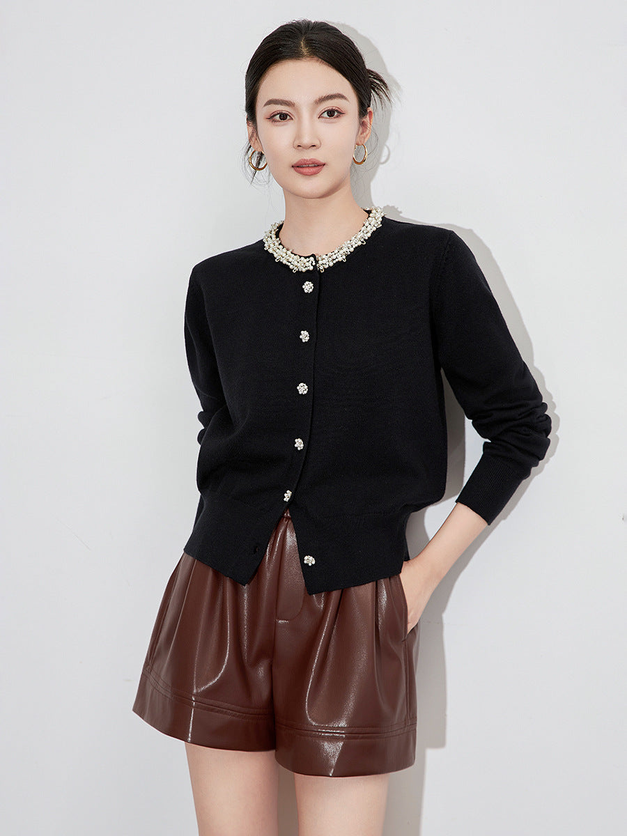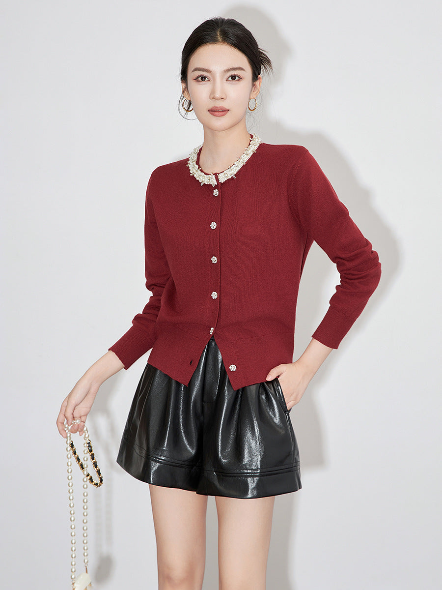 Light Sweet Gray French Age Reduction Bead Sweater Cardigan, No Pilling Knitted Cardigan Top 10% Wool Comfortable