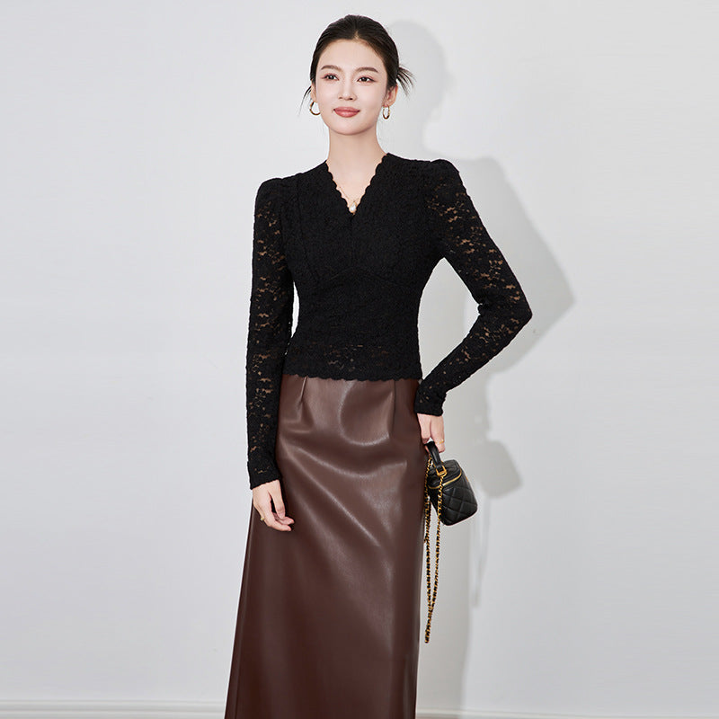 Socialite Style Slim Fit Thermal Fleece Lace Trim V-Neck Long Sleeve Knitted Sweater